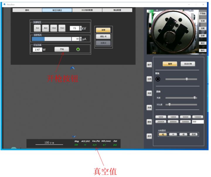 1、啟動(dòng)并放入樣品,將真空抽至0.01并保持至開槍按鈕常亮后,然后點(diǎn)擊開槍按鈕。