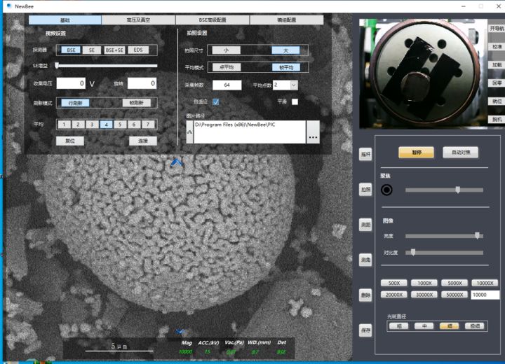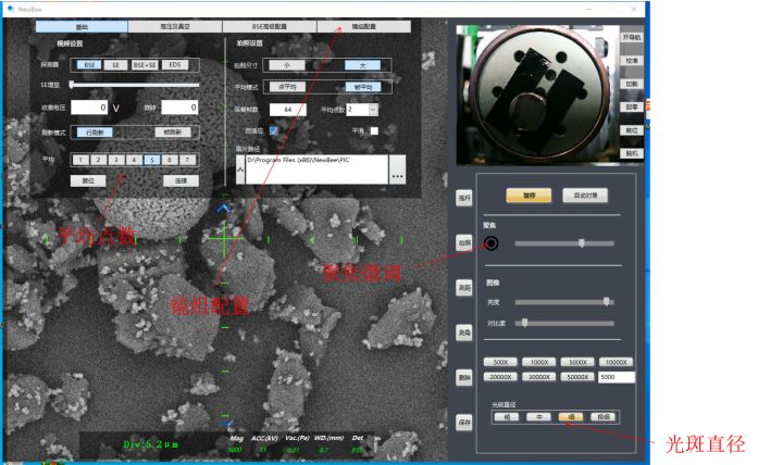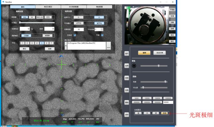 2、按照需要設(shè)定電壓值。并將"光斑直徑"調(diào)整至"粗"或者"中",勾選"自適應(yīng)"按鈕,調(diào)整"亮度""對(duì)比度",至出現(xiàn)較為明亮的圖像。后粗調(diào)"聚焦"條,至顯示較為清晰的圖像,然后將樣品臺(tái)移動(dòng)到想要拍照的樣品上。