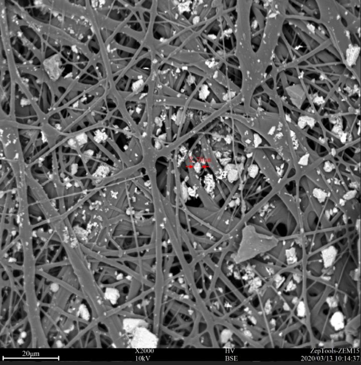 為避免污染對(duì)人身體造成傷害,我們將口罩戴到車載吸塵器上,在高污染環(huán)境下抽氣5分鐘,這時(shí)的吸氣量與人呼吸4小時(shí)相似,以此作為參考。我們可以看到口罩過濾層上密密麻麻的遍布著2 - 15 um大小的顆粒,如果沒有口罩的過濾,這些顆粒將全部被吸到肺部,并對(duì)人體造成傷害。